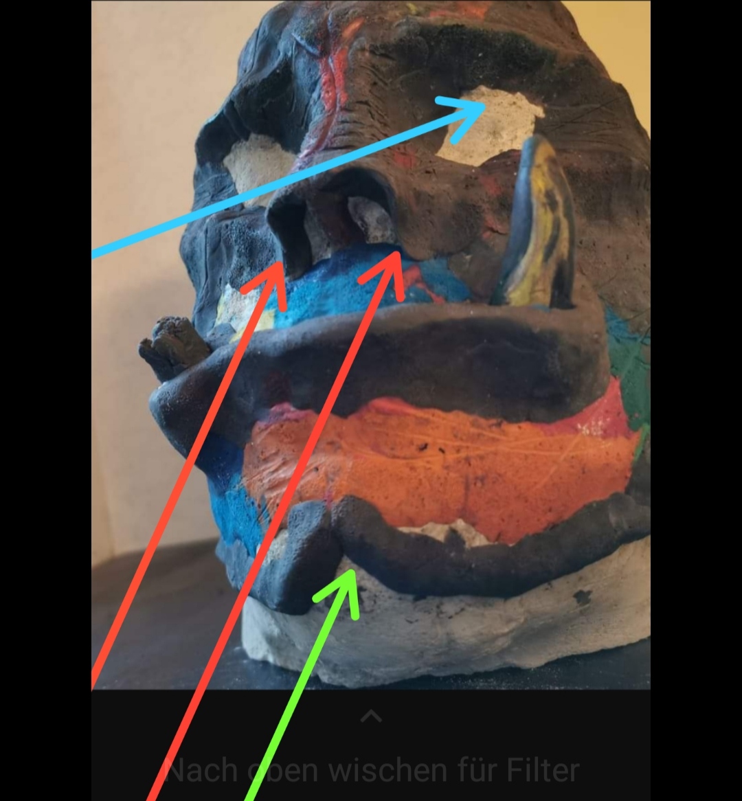 Der weiße Fleck bei dem abgebrochenen Hauer ist ein Rest weiße knete. Wenn ich irgendwann noch mal ne Maske machen werde dann vermische ich vorher alles an knete zu einer grauen Masse und arbeite dann mit der dann hab ich dann nicht so die Farbe im Gesicht