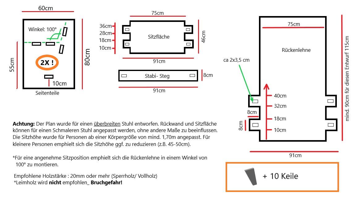 Es handelt sich bei der Bauanleitung um den grundliegenden Rohbau der Stühle, jeder kann natürlich nachher selbst entscheiden, wie der Stuhl in seiner finalen Form aussehen soll (Kanten abrunden/ Rückenlehne individualisieren/ Material aussparen etc.)