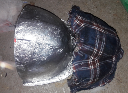 Schulterplatte aus Linothorax, mittlerweile steinhart (10 -12 Schichten Baumwolle.. irgendwann hab ich vergessen weiter mitzuzählen):