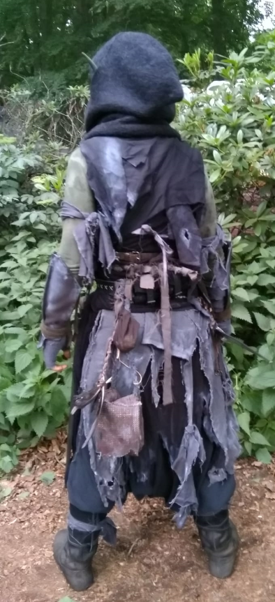 -einen ledernen Gugel, um insbesondere den Frontteil des Kostüms noch ein wenig "zerfetzter" aussehen zu lassen