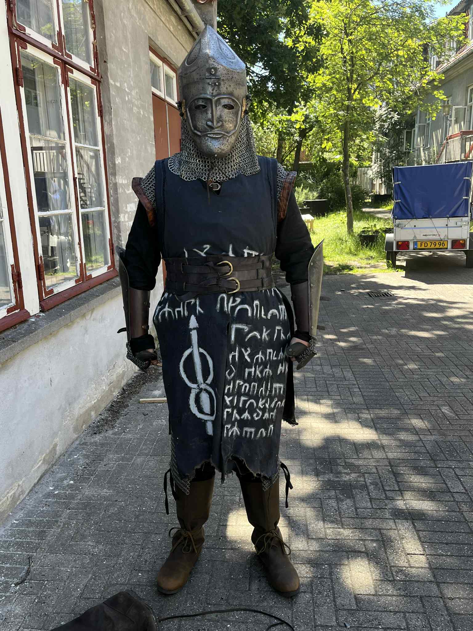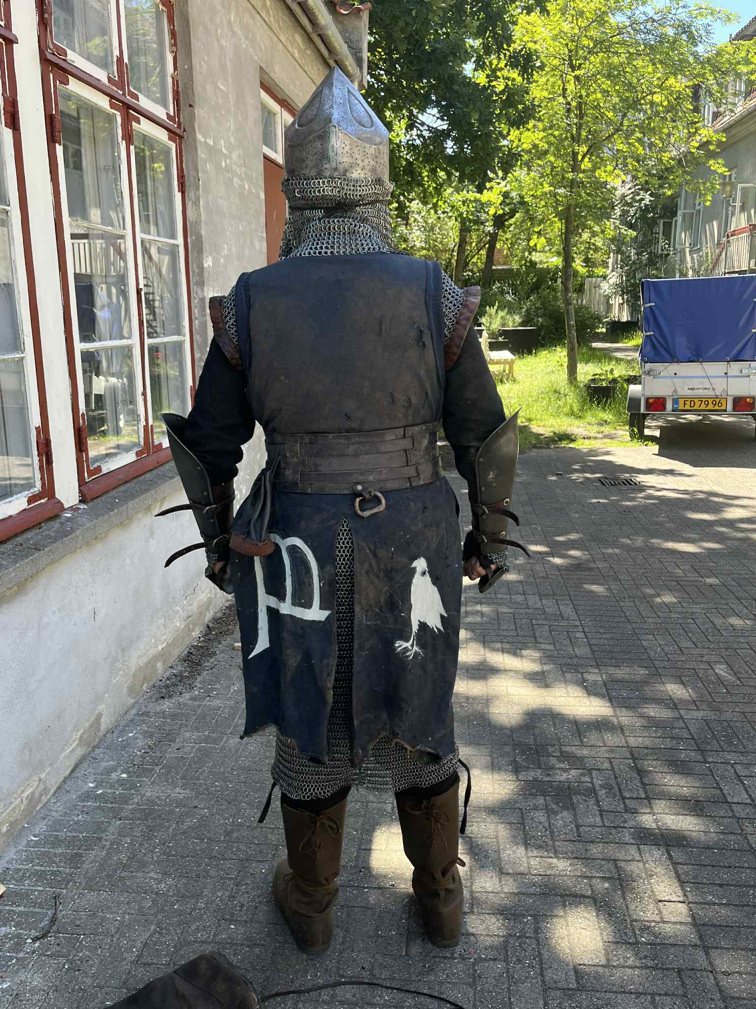 The basics of your outfit are great, but we're particularly struck by the area around the chest and shoulders. These still seem very empty. In the back photo, you can see that the tabard has a good used look, but that's not enough. We would like to ask you to do some work in the shoulder/chest area.