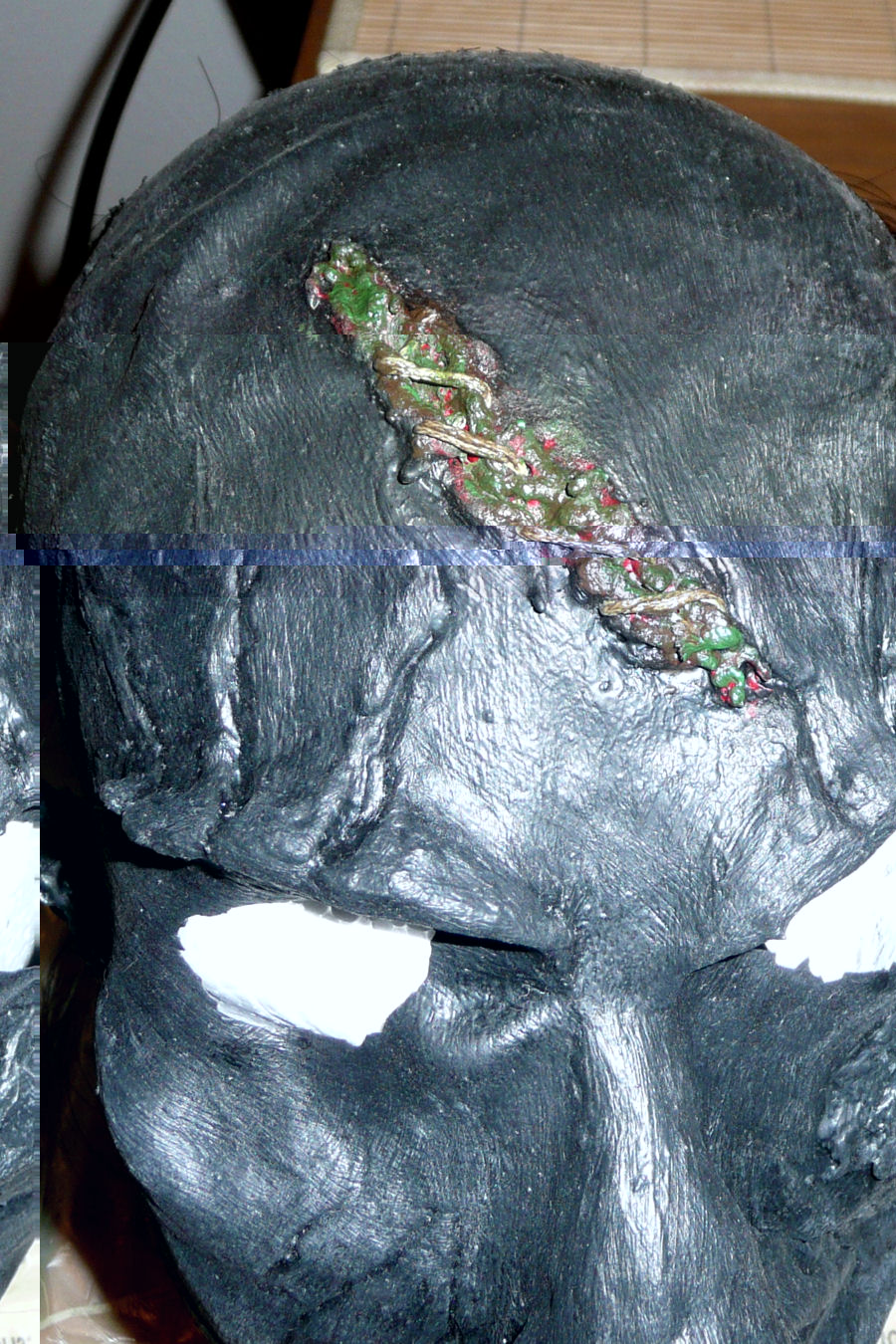 dunkel das rot der wunde einfach ab. machs irgendwie ekelig aber so das es zum rest passt * als wär die wunde shcon älter* und näh sie locker zusammen mit zwirn oder kettenringen klammern .