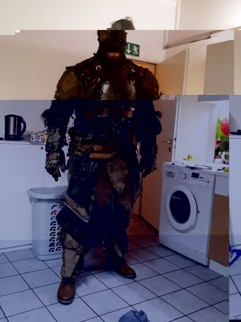 Dazu gibts nun mehr oder Minder n Update. Zunächst: Die Schulterrüstung lasse ich weg. Das Leder, dass ich genommen habe um die Teile zusammen zu halten sind viel zu rissig. (Und irgendwie komm ich mir nur mit dem Fell am Kragen breiter vor) Ich werde irgendwann die Nieten irgendwie entfernen und neues Leder einsetzen, also reparieren und dann zum sehr günstigen Verkauf anbieten, wenn die bei den GMK keiner brauchen kann.