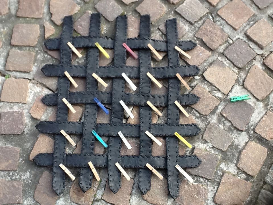11. Schritt: Alle Riemen werden passend geflochten und zurecht gelegt und mit Wäscheklammern fixiert.