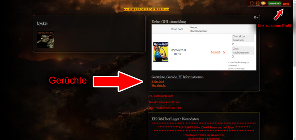 In unserem Orgabereich haben wir jetzt ein Gerüchteformular, mit dem wir für euch eben jene Gerüchte erstellen können. Und praktischerweise findet ihr eben jene Gerüchte dann in eurem orklager-Profil bei eurer OHL-Anmeldung. Und bei dem lustigen Gerüchtespiel könnt ihr auch mitmachen - ist vermutlich Einigen auch bekannt
